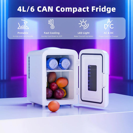 Mini Compact Refrigerator with Gaming Light,4L Capacity/6 Cans Portable Mini Fridge,For Bedroom,Car,Office and Dorm,Small Cooler for Cosmetics,Beverage and Food,White